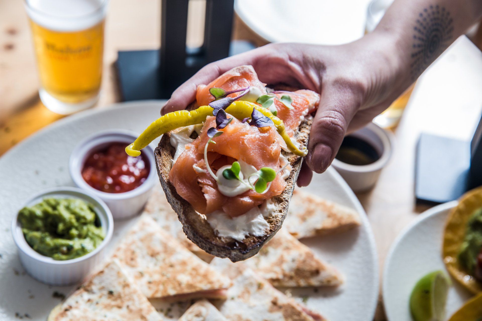 (Tostadas, Tomate, Aguacate, Rúcula y Salsa holandesa)